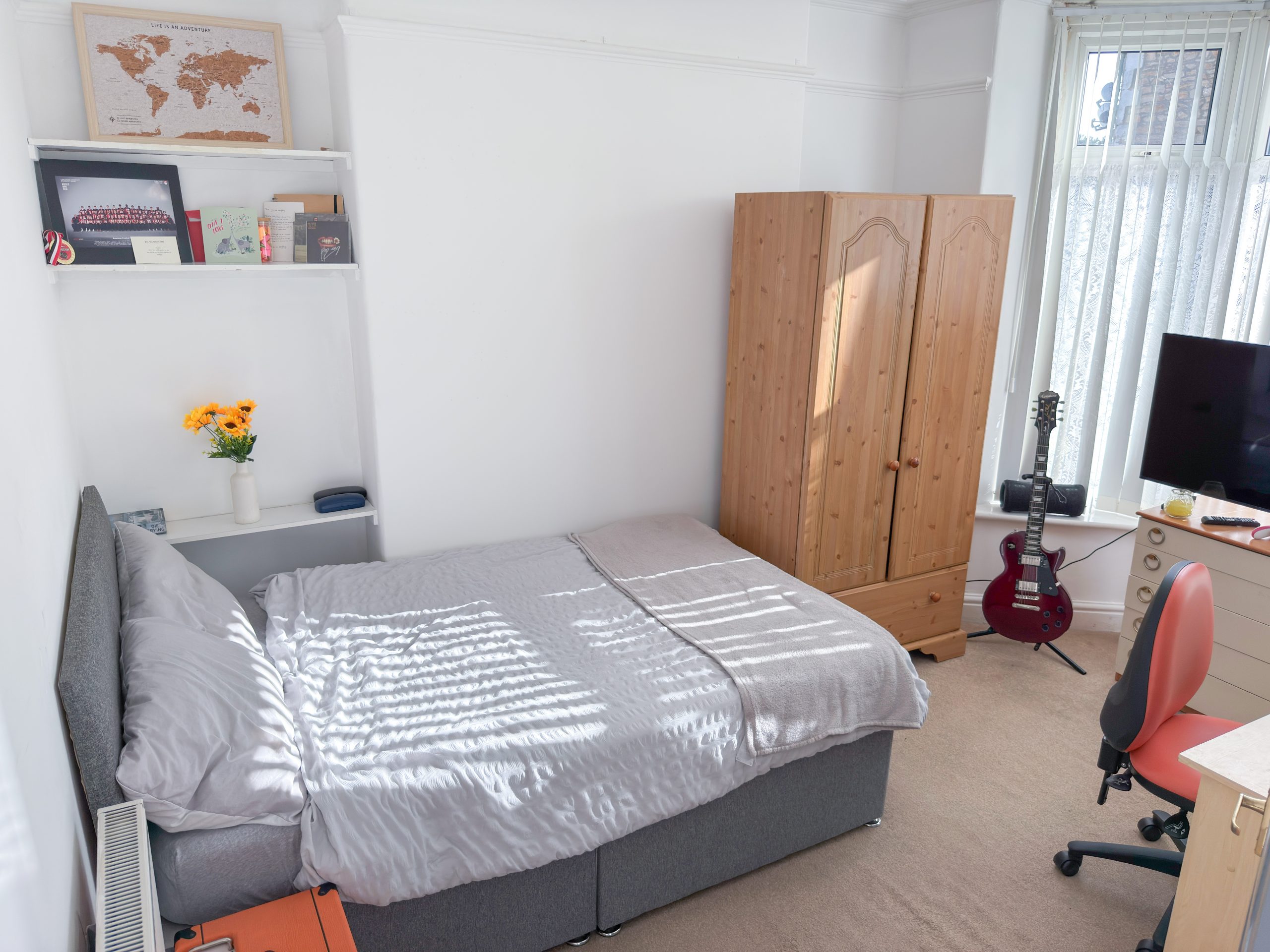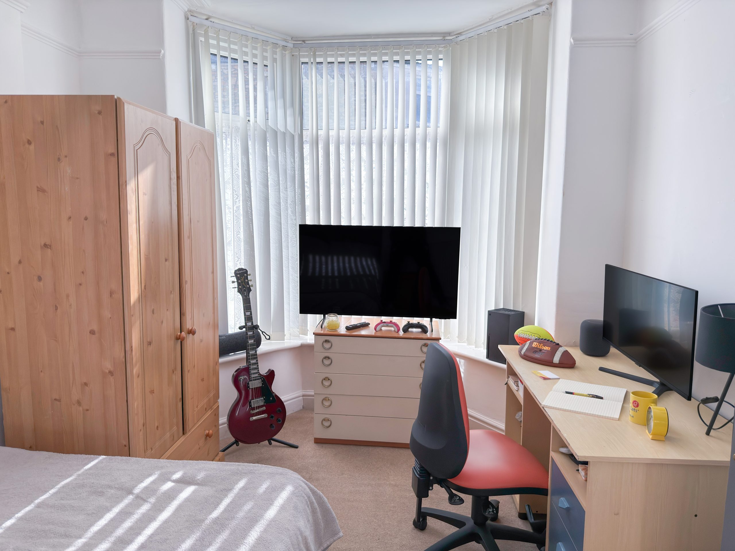 This is a three storey terraced house with four bedrooms, most of which can fit a 4ft or 3/4 bed. The house has 2 separate shower rooms and toilets (very unusual for a 4 bed house!), as well as free washing/drying facilities and unlimited ULTRAFAST fibre broadband readily fitted for when you move in.