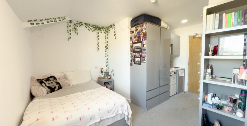 This is a four bed penthouse flat with gorgeous views over the city. Studio 2 is luxury studio style bedroom with a smart TV, double bed, fridge, microwave and en-suite shower room. The studio room is spacious; at 15M², larger than most campus/purpose built rooms in Lancaster. The flat also contains a large kitchen/lounge area complete with 50″ TV and even a dishwasher. The Railton has a lift, a bike store and a private court yard for tenants. Free washing/drying facilities are included, along with unlimited fibre broadband readily connected for when you move in.